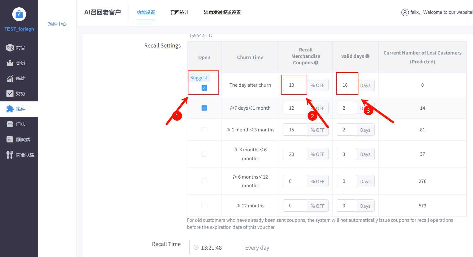 1.根据流失时间段内流失的客户数量进行参考,勾选需要发送的时间段 2.设置发送商品优惠劵的折扣率 3.设置发送商品优惠劵的有效时间