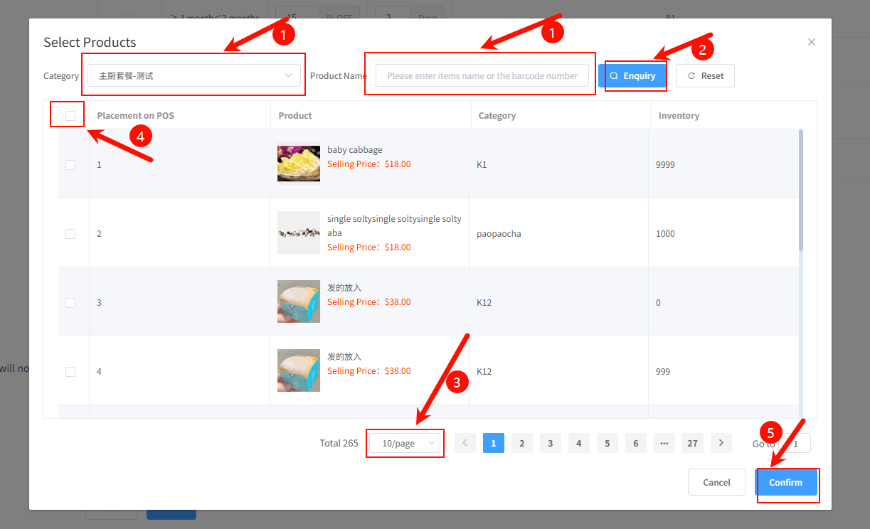 **部分毛利低的商品或者用于加料的商品,不希望进行折扣出售,加入不参与AI召回后,不发送该商品优惠券** 1.选择分类 1.产品名称搜索 2.确认搜索 3.选择一页展示更多数据 4.全选本页 5.确定添加至不参与召回