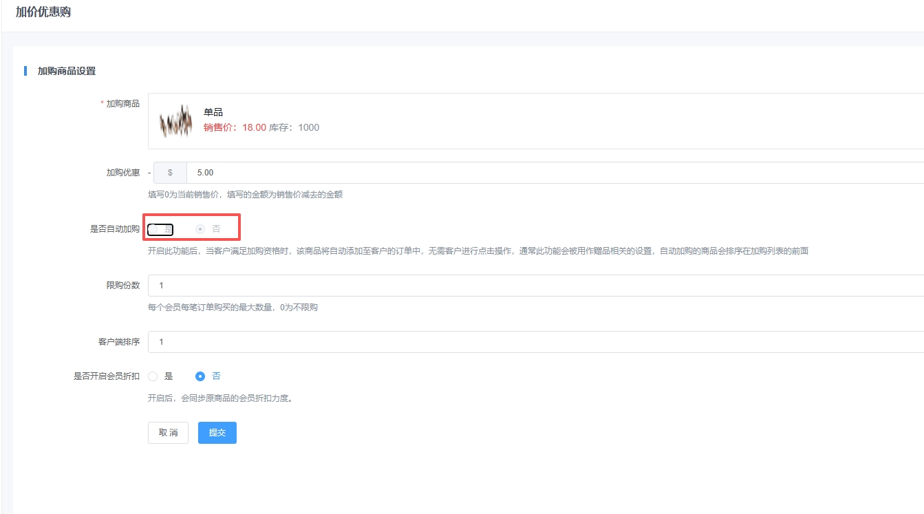 **需要选择加料的商品,无法选择是否自动加购,默认为不能自动加购 自动加购适用于赠品相关的设置,符合要求后无需客户选择,自动加购至购物车**