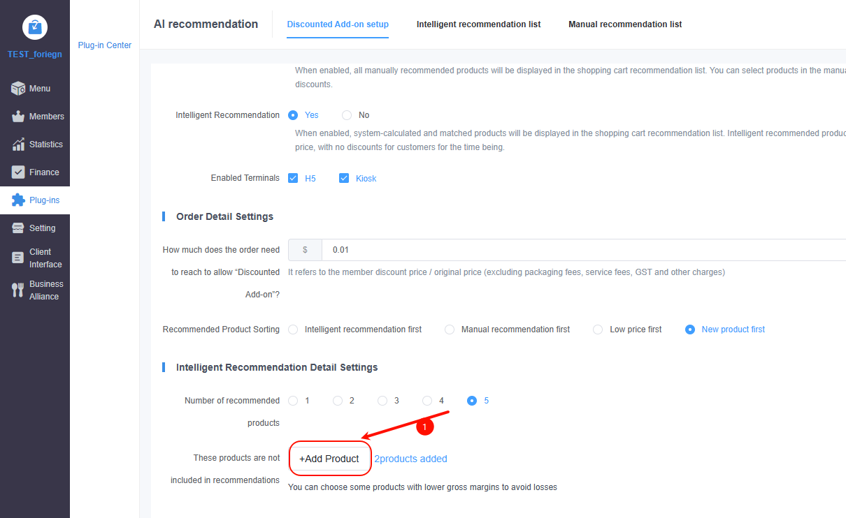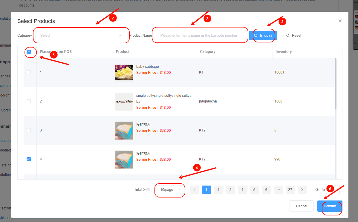 **部分毛利低的商品或者用于加料的商品,不希望进行商品推荐,加入不参与推荐后,不进行智能推荐** 1.点击选择添加商品 2.选择分类 2.产品名称搜索 3.确认搜索 4.选择一页展示更多数据 5.全选本页 6.确定添加至不参与推荐