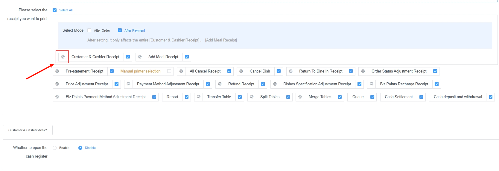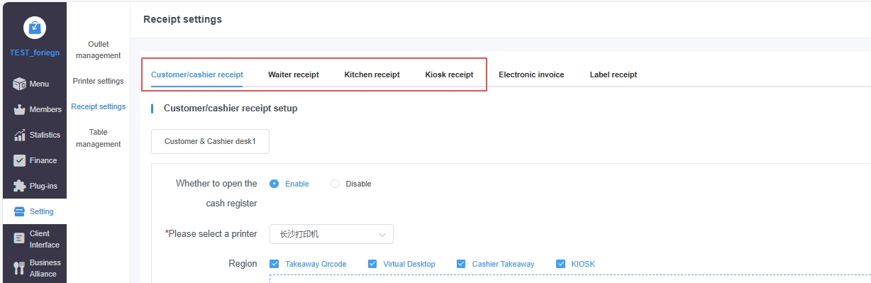 **This article explains how to change the language in which receipts are printed 此篇讲解如何更改打印小票的语言** ## Operation entrance 操作入口 后台链接:https://pos.amfuture.sg/shop/#/login  ## Operation process 操作流程 ### 1.Select the receipt type 选择小票类型 Select the receipt that needs to be modified: 'Customer Checkout Receipt / Waiter receipt / Kitchen Receipt / Kiosk receipt' 选择需要修改的小票‘顾客收银台小票/跑堂小票/后厨小票/点餐机小票’  ### 2.receipt settings 进入小票设置 Find the area where you need to modify the receipt, click the 'Settings' icon of the receipt you need to modify, and enter the receipt settings 找到需要修改小票的区域,点击需要修改小票的‘设置’图标,进入小票设置  ### 3.Adjust printing language 调整打印语言 After entering the receipt settings, slide to the bottom and adjust the printed 'Language' and 'Dine-in,Meal Language' to the required language '中文/English/简中+English' 进入小票设置后,滑动到最底部,调整打印的‘菜名语言’和‘堂食、加餐语言’为需要的语言‘中文/English/简中+English’  ### 4.Save the settings 保存设置 After checking the configuration again, click the 'Save' button to save the modified settings (==Note: this operation cannot be undone, please check the modifications again==) 再次检查配置后,点击‘保存’按钮,保存修改的设置(==注意:此操作无法复原,请再次检查修改内容==)