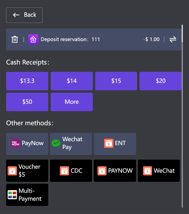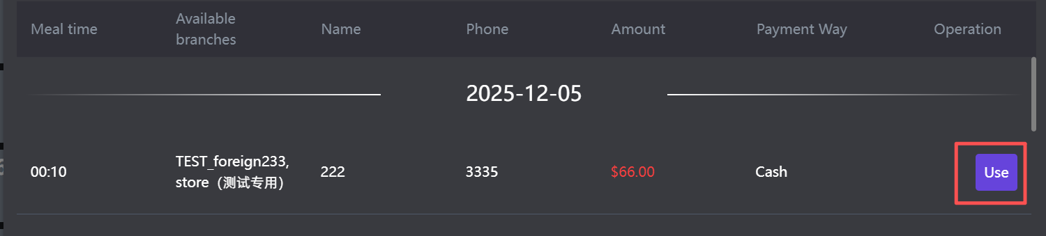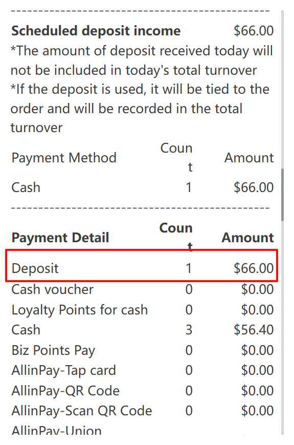 **How to use the deposit after paying the deposit 在交了押金之后,如何进行使用押金** ## Operation process 操作流程 ### 1.Click Deposit Pay 点击押金支付 After opening the table normally to place an order, select 'Deposit' to pay 正常开启桌台下单后,选择‘押金’支付  ### 2.Click Use 点击使用 According to the information provided by the customer, after finding the corresponding deposit, click Use (==the price of the order cannot be lower than the deposit price, otherwise it cannot be used==) 根据客户提供的信息,找到对应押金后,点击使用(==该订单的价格不能低于押金价格,否则使用不了==)  ### 3.Select the remaining payment method 选择剩余支付方式  ## Report presentation 报表展示 If it has already been used, it will be counted towards the actual income 如果已经使用,会计算到实际收入内