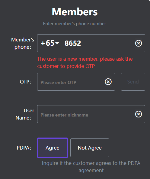 **Use of the queuing function 排队功能的使用** ## Operation process 操作流程 ### 1.Member login 会员登录 After entering the mobile number, tap Confirm 输入手机号后,点击确认  ### 2.Non-member login 非会员登录 #### ①Register as a member 注册会员 Enter the mobile phone number and click OK, then ask for the OTP sent to the customer, fill in the name and select 'Do you agree with the PDPA' 输入手机号点击确定后,询问发送给客户的OTP、填写名称和选择‘是否同意PDPA’  #### ②Skip membership 跳过会员 Click Skip member login 点击跳过会员登录  ### 3.Enter the pax 输入用餐人数  ### 4.Select corresponding table type 选择对应桌子类型  ### 5.Click Confirm 点击确认 The number was successful 取号成功  ### 6.View/delete numbers 查看/删除号码 Display numbers, display in first-come, first-served order, if you don't need to eat, click 'Delete' to delete the number 展示号码,根据先后顺序进行展示,如果不需要用餐,点击‘删除’即可删除号码  ## Print receipts 打印小票 ### Members line up 会员排队  ### Non-members queue 非会员排队