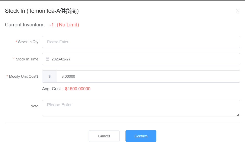 **此篇文档讲解如何操作商品入库** ## 操作流程 ### 1.快速查找商品 通过输入商品的‘分类、名称、商品编码’点击查询后,即可快速查找到商品  ### 2.点击入库  ### 3.输入入库数据 输入入库商品的‘数量、日期、单位成本、备注’  ### 4.点击确认 点击确定入库,入库成功,库存更改成功