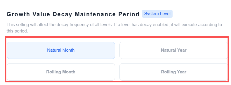 **此篇文档讲解会员等级管理中的全局配置操作** ## 操作流程 ### 1.点击全局操作  ### 2.选择衰减模式 自然年/月:根据自然年份/月份进行衰减(例:每年的1月1日/每月的1号) 滚动年/月:根据会员注册时间进行衰减(例:注册会员当天往后推算一年/一月)  ### 3.选择升级保护 自行选择,衰减前多少天进行升级时,会跳过本次衰减,==开启后可以自定义设置保护天数==  ### 4.填写规则与说明 填写会员等级的规则以及说明,进行解释会员等级的权益以及解释  #### 内容展示
