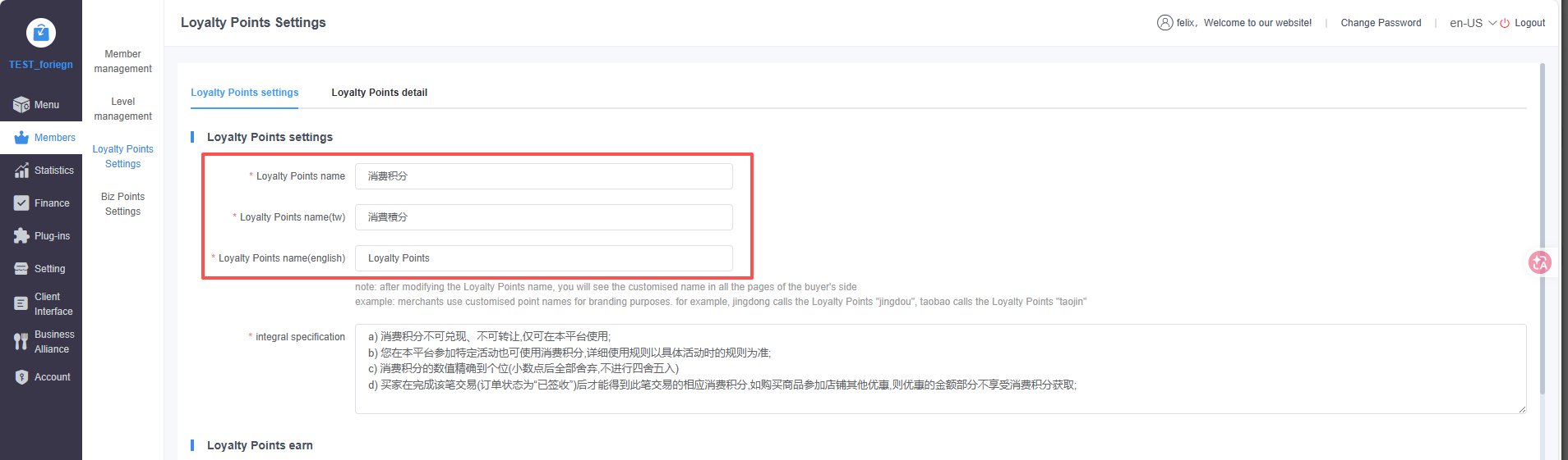**This document explains how to modify the name of a credit for consumption 本文档说明,如何进行修改消费积分的名称** ## Operation process 操作流程 ### 1.Loyalty Points settings 消费积分设置 Change the name of the Loyalty Points in 'Loyalty Points settings' (default is Loyalty Points) 在‘消费积分设置’中进行修改消费积分的名称(默认为Loyalty Points)  ## Change the presentation 更改展示 ### Cash register 收银台   ### H5