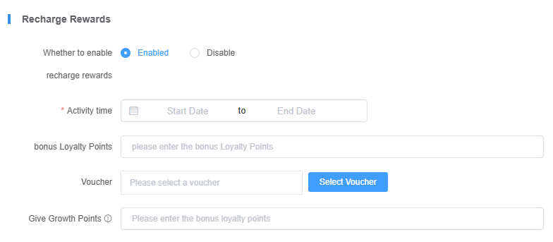 **此篇文档讲解如何设置充值套餐的具体设置内容,并解释各配置项的含义** ## 操作流程 ### 1.点击充值套餐  ### 2.点击新增  ### 3.填写套餐名称  ### 4.填写支付金额  ### 5.填写赠送积分 填写套餐充值赠送部分的积分,==如果不需要赠送则填0==  ### 6.填写到账积分 填写套餐充值后,本金部分积分  ### 7.填写套餐排序 填写该套餐在所有套餐中的排序  ### 8.充值奖励 开启后,可以设置活动时间,并且设置活动的奖励,在活动时间内进行充值,奖励会自动发送到账户中