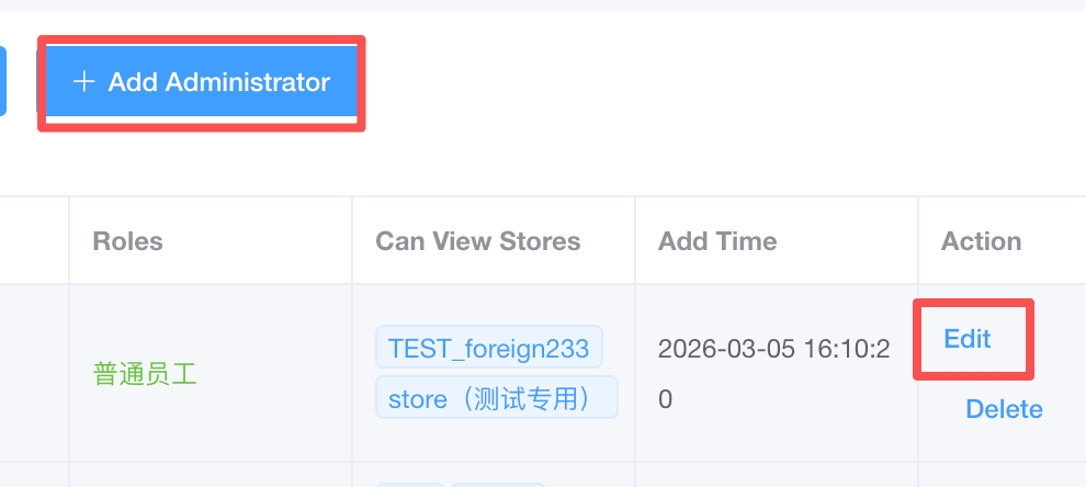 **This section describes how to add, edit, and disable background administrators 本节介绍后台管理员的添加、编辑、禁用等操作说明** ### 1.Select administrators 选择管理员列表  ## Add/Edit 添加/编辑 ### 1.Add/Edit administrators 添加/修改管理员 Click Add/Edit Administrator to perform the corresponding operation 点击添加/编辑管理员,进行对应的操作  ### 2.Enter basic information 输入基本信息 Enter the administrator name, mobile phone number, and other information 输入管理员名称、手机号等信息  ### 3.Enter login account 输入登录账号 Enter the account number when the administrator logs in 输入管理员登录时的账号  ### 4.Select Admin status 选择管理员状态 If the status is off, the admin account cannot log in to the back store 如果状态关闭,则该管理员账号无法登录后台门店  ### 5.Choose Roles 选择角色 If you select the role of the administrator, the administrator account will have the permissions in the background when you log in 选择管理员对应的角色,则该管理员账号登录时会拥有后台的那些权限  ### 6.Enter password 输入密码 输入管理员账户对应登录的密码并二次确认  ### 7.Select store permissions 选择门店权限 Select which store data can be viewed for the administrator (for multi-store chains) 选择该管理员对应的可以查看哪个门店的数据(适用于多门店的连锁店)  When you log in, you will select the store you want to enter 选择多门店在登录时会进行选择需要进入的门店  ### 8.Click Confirm 点击确认 If you don't click Save, the above adjustments won't take effect 如果没有点击保存,上述调整将不生效