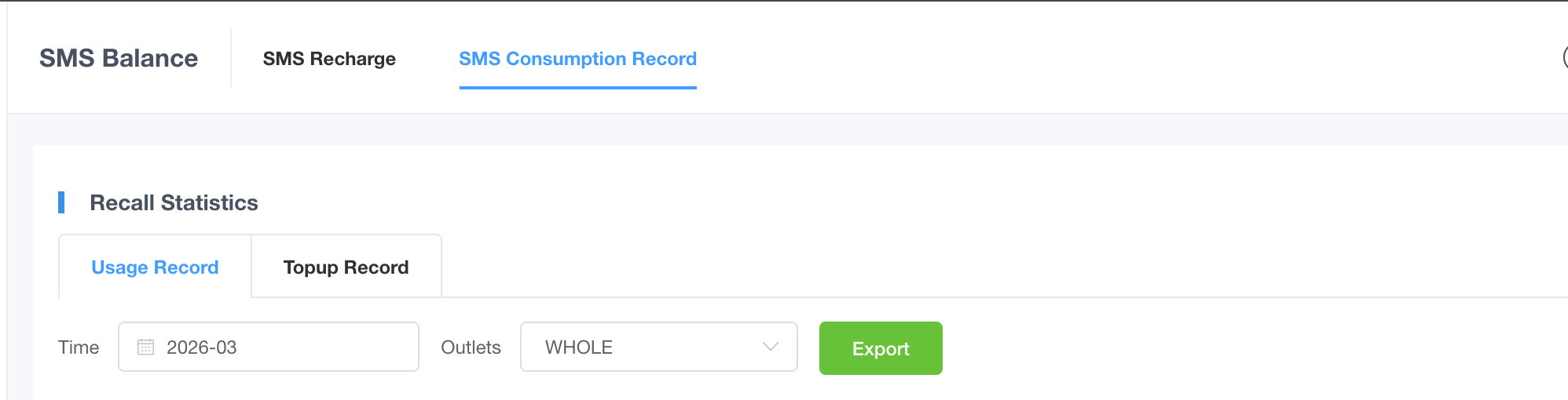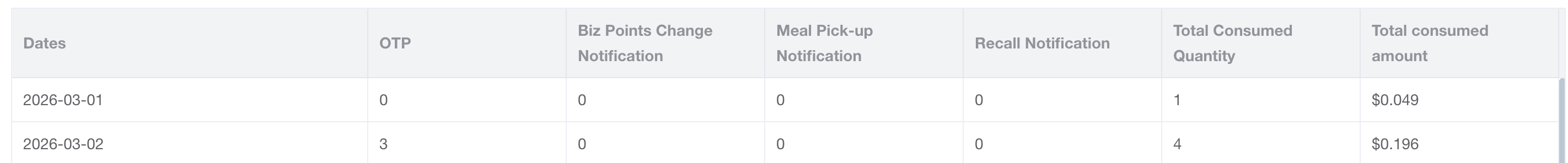 > This page allows merchants to track their SMS usage and related expenses across different outlets, ensuring transparent billing for successfully delivered messages. > 本页面供商户追踪不同门店的短信使用情况及相关费用,确保仅对成功发送的短信进行透明计费。 --- ### 1. Page Operations & Field Explanations (Top-to-Bottom) 页面操作与字段详解(从上至下) #### Filter & Action Area 筛选与操作区  * **Operation Guide**: Select specific months and outlets to filter the consumption data, and export the records for detailed analysis. * **操作说明**:选择特定月份和门店以过滤消耗数据,并导出记录以进行详细分析。 | Field/Action <br> 字段/操作名称 | Explanation <br> 含义与操作解析 | | :--- | :--- | | **Time** <br> **时间** | Select the target month (e.g., 2026-03) to filter the consumption data. <br> 选择目标月份(如 2026-03)以筛选消耗数据。 | | **Outlets** <br> **店铺** | Filter the SMS usage by a specific branch or choose 'WHOLE' for all branches. <br> 按特定分店筛选短信使用情况,或选择“全部”查看所有门店。 | | **Export** <br> **导出** | Download the current usage data report as a spreadsheet. <br> 将当前的使用数据报表下载为电子表格。 | #### Consumption Overview 消耗数据概览  * **Operation Guide**: Quickly review the total count of SMS sent and the total cost incurred during the selected period. * **操作说明**:快速查看所选期间内发送的短信总数和产生的总费用。 | Field/Action <br> 字段/操作名称 | Explanation <br> 含义与操作解析 | | :--- | :--- | | **Total number of SMS consumed** <br> **短信消耗总条数** | The total aggregate count of messages successfully sent during the filtered period. <br> 在筛选期间内成功发送的短信总累计条数。 | | **Total consumed amount** <br> **消耗金额总计** | The total monetary cost corresponding to the consumed SMS. *Only successfully delivered SMS will be charged.* <br> 消耗短信对应的总费用。*只有实际发送成功的短信才会扣款。* | #### Consumption Trend Chart 消耗趋势图表  * **Operation Guide**: Visually track the daily fluctuations in SMS consumption quantity and the corresponding financial amount through the graph. * **操作说明**:通过图表直观追踪每日短信消耗条数和相应金额的波动情况。 | Field/Action <br> 字段/操作名称 | Explanation <br> 含义与操作解析 | | :--- | :--- | | **Consumed Quantity** <br> **消耗条数** | The trendline (red) indicating the daily volume of SMS used. <br> 表示每日使用的短信量的趋势线(红色)。 | | **Consumed Amount** <br> **消耗金额** | The trendline (blue) indicating the daily monetary cost of the SMS. <br> 表示每日短信资金成本的趋势线(蓝色)。 | #### Consumption Data List 消耗数据列表  * **Operation Guide**: View the precise daily breakdown of SMS usage categorized by specific notification types in a tabular format. * **操作说明**:以表格形式查看按特定通知类型分类的精确每日短信使用明细。 | Field/Action <br> 字段/操作名称 | Explanation <br> 含义与操作解析 | | :--- | :--- | | **Dates** <br> **日期** | The specific date of the recorded consumption. <br> 记录消耗的具体日期。 | | **OTP** <br> **OTP** | Number of One-Time Password verification messages sent. <br> 发送的一次性密码验证短信数量。 | | **Biz Points Change Notification** <br> **商业积分变动通知** | Number of messages sent to notify customers about changes in their business points. <br> 向顾客发送的关于其商业积分变动的通知短信数量。 | | **Meal Pick-up Notification** <br> **取餐通知** | Number of alerts sent to remind customers to collect their food (e.g., for takeaway orders). <br> 发送给顾客提醒其取餐的通知数量(例如外卖自取订单)。 | | **Recall Notification** <br> **召回通知** | Number of marketing messages sent to re-engage past customers. <br> 发送给过往顾客以吸引其再次消费的营销短信数量。 | | **Total Consumed Quantity** <br> **总消耗条数** | The sum of all types of messages sent on that specific day. <br> 当日发送的所有类型短信的总和。 | | **Total consumed amount** <br> **总消耗金额** | The total daily cost incurred from all sent messages. <br> 当日所有发送短信产生的总成本。 | --- ### 2. Frequently Asked Questions (FAQ) 常见问题 * **Q: Will I be charged for messages that failed to deliver to the customer's mobile phone?** **Q:如果短信未能成功发送到顾客手机,我会被扣费吗?** * **A:** No. The system is designed to ensure that only actual, successfully delivered SMS are billed and deducted from your account balance. **A:** 不会。系统机制确保只有实际发送成功的短信才会被计费,并从您的账户余额中扣除。 * **Q: Why are there different columns for various notification types?** **Q:为什么会有不同通知类型的单列显示?** * **A:** This breakdown helps you analyze which part of your operations (e.g., security OTPs vs. marketing recalls) is consuming the most SMS quota, allowing for better budget management. **A:** 这种明细分类有助于您分析业务的哪个环节(例如安全 OTP 与营销召回)消耗了最多的短信配额,从而更好地进行预算管理。