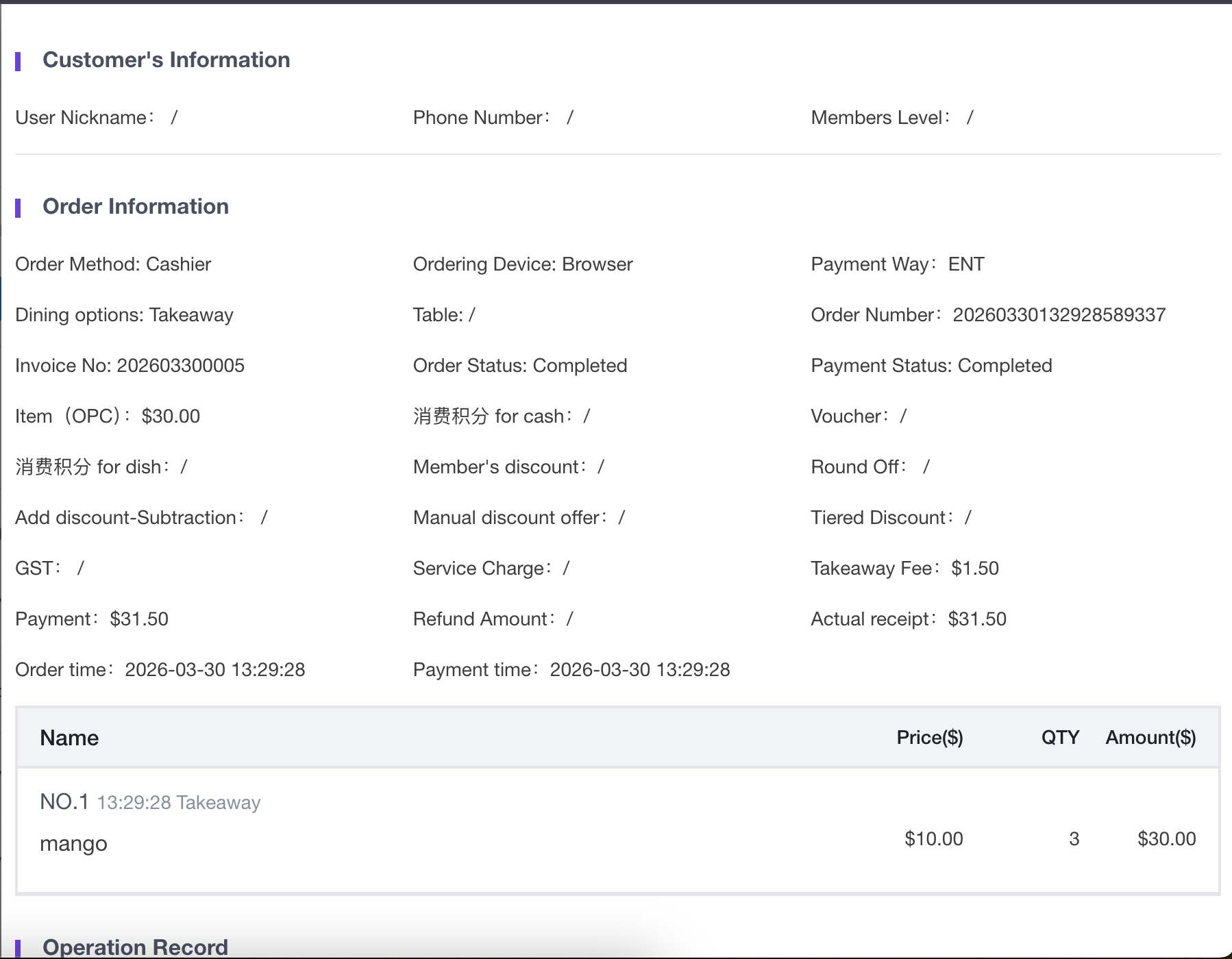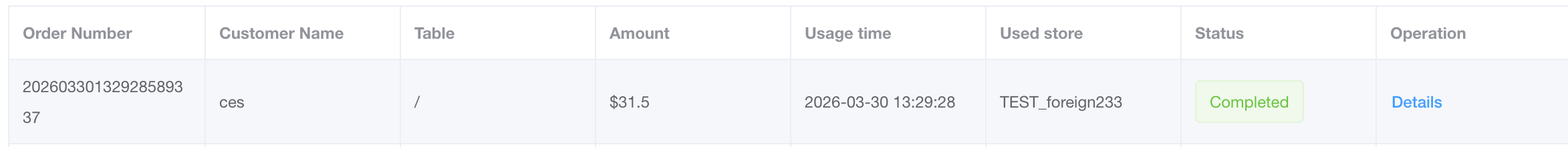 > This page allows merchants to manage and review Entertainment (ENT) transactions, providing detailed insights into complimentary orders, personnel usage, and comprehensive order records. > 本页面供商户管理和审查业务招待(ENT)交易,提供关于免单/招待订单、人员使用情况及详尽订单记录的深入视图。 --- ### 1. Page Operations & Field Explanations (Top-to-Bottom) 页面操作与字段详解(从上至下) #### Filter & Action Area 筛选与操作区  * **Operation Guide**: Use the dropdown menus and date pickers to filter the entertainment transaction records, and export the data for external auditing. * **操作说明**:使用下拉菜单和日期选择器过滤招待交易记录,并导出数据用于外部审计。 | Field/Action <br> 字段/操作名称 | Explanation <br> 含义与操作解析 | | :--- | :--- | | **Select Outlets** <br> **选择店铺** | Filter the transactions by a specific branch. <br> 按特定分店筛选交易记录。 | | **Start Date / End Date** <br> **开始日期 / 结束日期** | Define the specific timeframe to filter the transaction data. <br> 定义筛选交易数据的特定时间范围。 | | **Name** <br> **姓名** | Filter records by the specific personnel or staff member who authorized/used the entertainment allowance. <br> 按授权/使用招待额度的特定员工或人员姓名筛选记录。 | | **Status** <br> **状态** | Filter by the current status of the order (e.g., WHOLE/All, Completed). <br> 按订单的当前状态(如:全部、已完成)进行筛选。 | | **Query** <br> **查询** | Click to apply the selected filters and refresh the overview and list below. <br> 点击以应用选定的筛选条件并刷新下方的概览与列表。 | | **Export** <br> **导出** | Download the queried transaction list as a spreadsheet. <br> 将查询到的交易列表下载为电子表格。 | #### Transaction Overview 交易数据总览  * **Operation Guide**: Quickly review the macro-level statistics for the filtered entertainment transactions. * **操作说明**:快速查看经过筛选的招待交易的宏观统计数据。 | Field/Action <br> 字段/操作名称 | Explanation <br> 含义与操作解析 | | :--- | :--- | | **Total Transactions** <br> **总交易笔数** | The total count of entertainment orders within the selected criteria. <br> 符合所选条件的招待订单总笔数。 | | **Total Entertainment Amount** <br> **总招待金额** | The total monetary value (in SGD) of all complimentary/entertainment orders. <br> 所有免单/招待订单的总金额(新加坡元)。 | | **Average Entertainment Amount** <br> **平均招待金额** | The average value per entertainment transaction. <br> 每笔招待交易的平均金额。 | | **Active Personnel Count** <br> **活跃人员数** | The number of unique staff members who have utilized the entertainment allowance during this period. <br> 在此期间使用过招待额度的独立员工人数。 | #### Transaction Data List 交易数据列表  * **Operation Guide**: View the specific details of each transaction and click "Details" to open the comprehensive order modal. * **操作说明**:查看每笔交易的具体明细,点击“详情”可打开完整的订单弹窗。 | Field/Action <br> 字段/操作名称 | Explanation <br> 含义与操作解析 | | :--- | :--- | | **Order Number** <br> **订单号** | The unique system-generated identifier for the transaction. <br> 系统为该笔交易生成的唯一标识符。 | | **Customer Name** <br> **顾客姓名** | The name associated with the customer or staff member for this order. <br> 与此订单关联的顾客或员工姓名。 | | **Table** <br> **桌台** | The specific table number where the order took place. <br> 产生该订单的具体桌台号。 | | **Amount** <br> **金额** | The total value of the order. <br> 订单的总金额。 | | **Usage time** <br> **使用时间** | The exact timestamp when the entertainment order was created or used. <br> 招待订单创建或使用的精确时间戳。 | | **Used store** <br> **使用门店** | The branch where the transaction occurred. <br> 发生该交易的门店。 | | **Status** <br> **状态** | The processing status of the order (e.g., Completed). <br> 订单的处理状态(例如:已完成)。 | | **Operation (Details)** <br> **操作(详情)** | Click "Details" to view the full breakdown of the customer info, order items, and operation logs. <br> 点击“详情”以查看完整的顾客信息、订单菜品及操作日志。 | #### Order Details Modal - Customer & Order Info 订单详情弹窗 - 顾客与订单信息  * **Operation Guide**: Review the comprehensive breakdown of the selected transaction, including dining type, fee deductions, and taxes. * **操作说明**:查阅所选交易的全面明细,包括就餐方式、费用抵扣及税费情况。 --- ### 2. Frequently Asked Questions (FAQ) 常见问题 * **Q: How does an "ENT" (Entertainment) payment method differ from a regular Cash or Card payment?** **Q:“ENT”(招待)支付方式与普通的现金或刷卡支付有何不同?** * **A:** ENT is an internal payment method used to account for complimentary meals, staff allowances, or PR expenses. It settles the bill to zero for the customer but records the value internally as an entertainment expense rather than actual cash collected. **A:** ENT 是一种内部支付方式,用于核算免单、员工餐额度或公关招待费用。它会将顾客的账单结算为零,但在内部将该价值记录为招待费用,而非实际收取的现金。