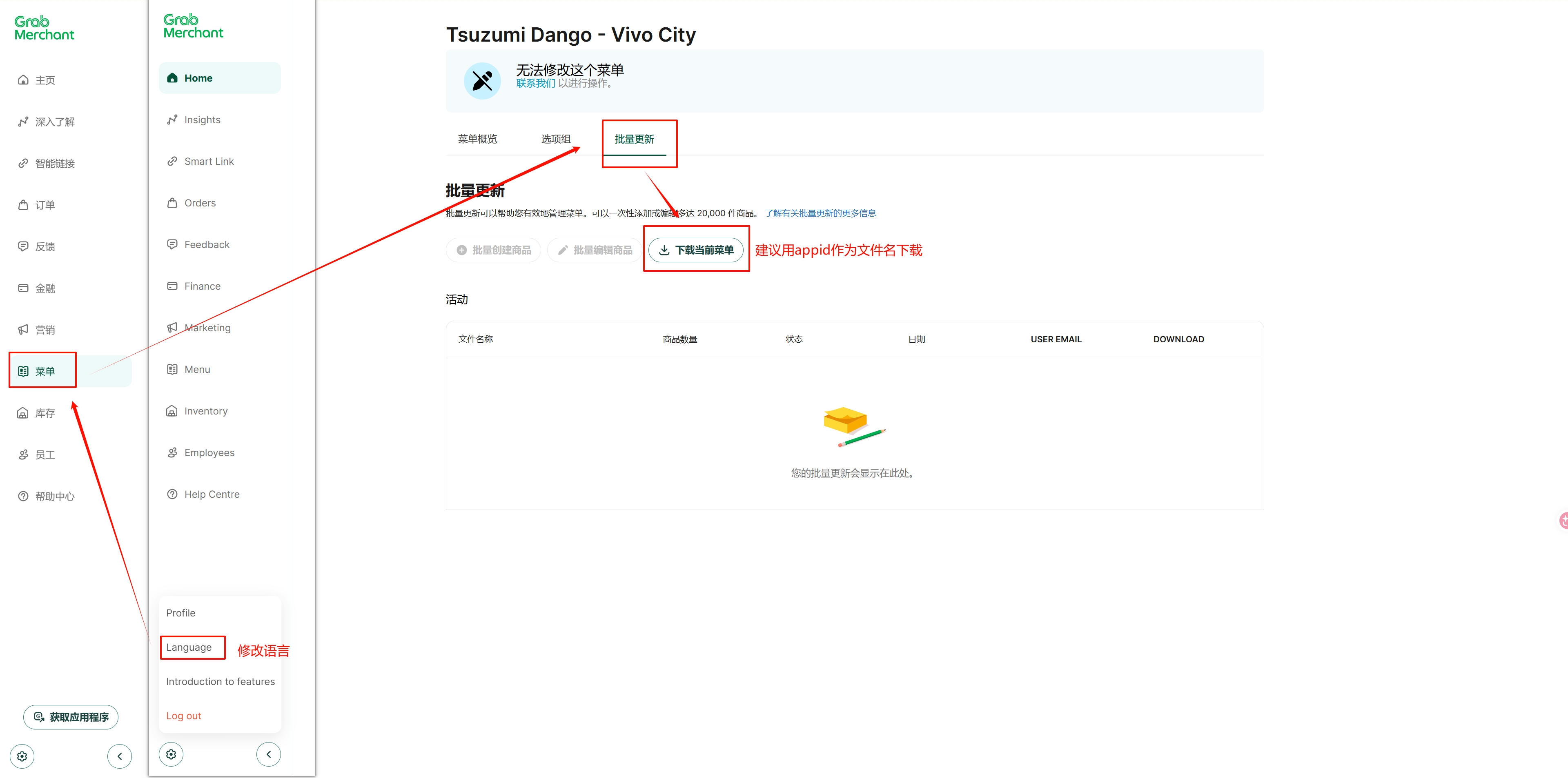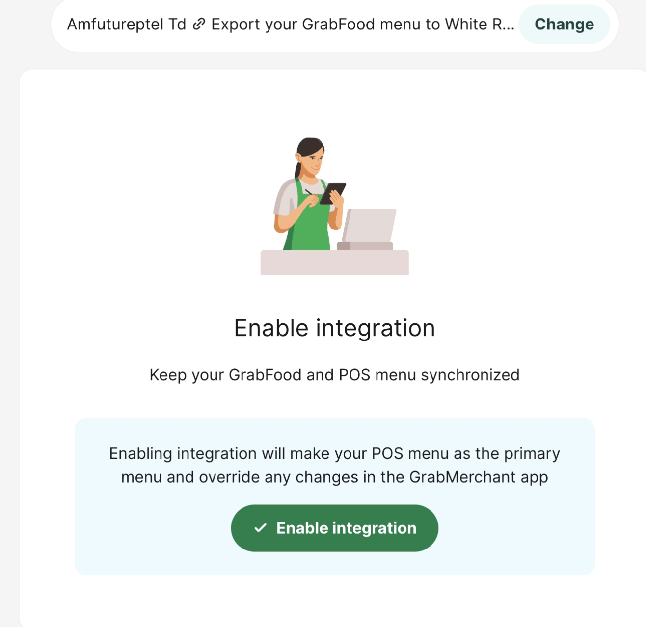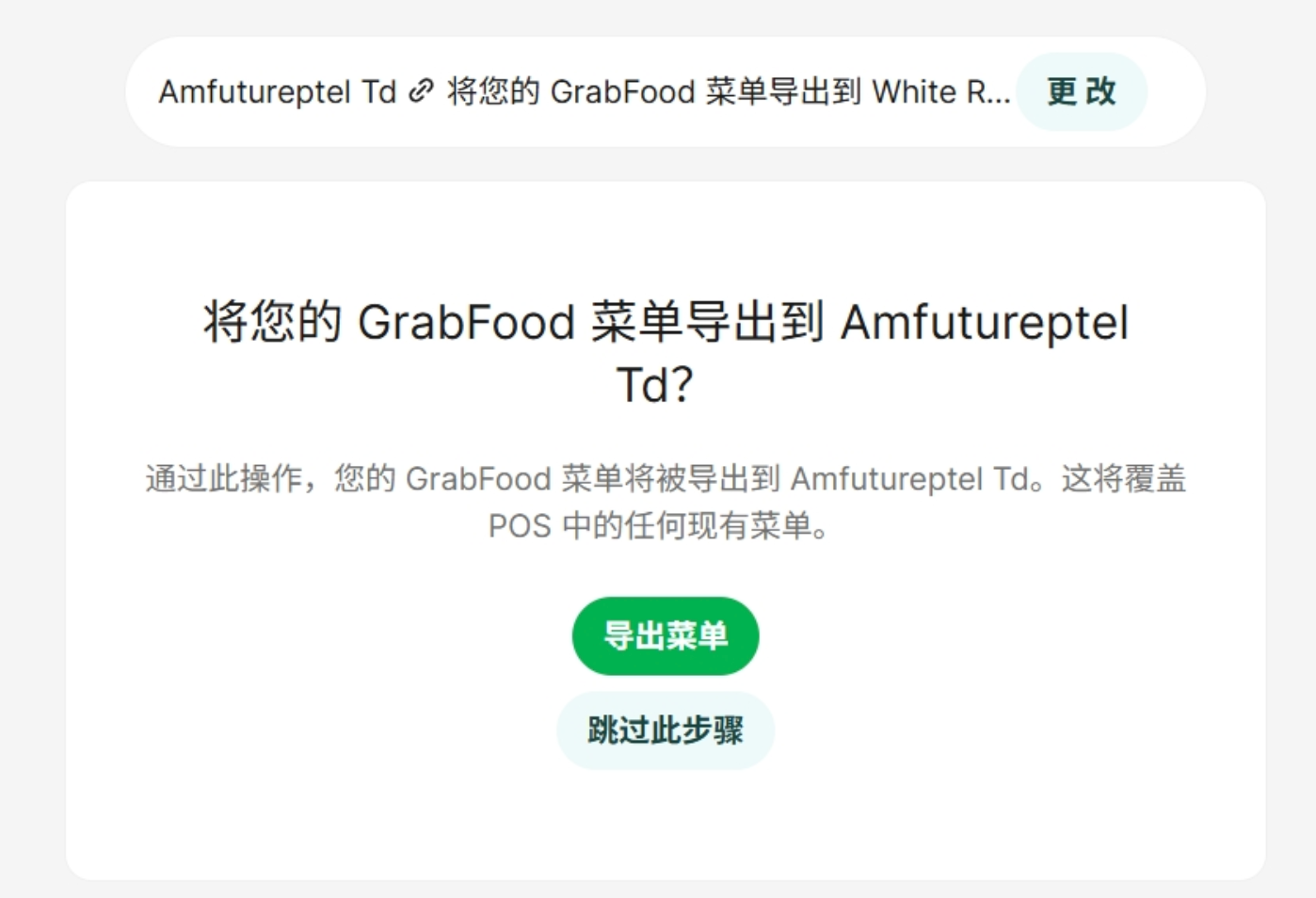> This section provides a detailed walkthrough for integrating your POS system directly with the Grab Delivery platform, enabling automated order synchronization and menu management. > After the synchronization is completed, when the customer places an order on the Grab platform, the system can obtain the corresponding order number and other information, and then proceed to the corresponding kitchen. <br> 本节提供了将您的 POS 系统与 Grab 外卖平台直接对接的详细操作指南,实现自动化的订单同步和菜单管理。 > 同步完成后,顾客在grab平台上下单后,系统能够获取到对应的订单号等内容,进入对应的厨房 1. **Obtain Integration Link**: For new stores, please contact our customer service team to generate your unique Grab synchronization link.And follow the instructions provided by the link to carry out the operation. <br> 1. **获取对接链接**:新店操作首先需要联系我们的客服人员,生成您专属的 Grab 同步链接,==并根据链接指引进行操作==。 2. **Login and Authorize**: Click the generated link to access the Grab login page. Log in with your Grab Merchant account. *(Note: Ensure you are logging into the correct store account. If your browser has saved credentials for multiple outlets, carefully switch to the correct one to avoid binding errors.)* <br> 2. **登录并授权**:点击生成的链接跳转至登录界面,登录商家的 Grab 账号。(*注意:确保登录正确的门店账号。如果您的浏览器保存了多家门店的凭据,请仔细切换以防止绑定错误。*)   3. **Menu Export (Optional)**: At the step "Export menu to AmfutureptelTd", you can choose to skip or export. This step currently only records logs in the background and will not genuinely overwrite your existing POS menu. <br> 3. **菜单导出(可选)**:在“将菜单导出到 AmfutureptelTd”这一步,您可以选择跳过或导出(目前系统仅在后台做日志记录,不会真正覆盖您现有的 POS 菜单)。  4. **Enable Integration**: Click the **Enable Integration** button. Once the page loading finishes and displays a success message, the Grab backend integration is officially complete. <br> 4. **完成整合**:点击 **Enable Integration** 按钮,页面转圈结束后看到成功提示,即代表 Grab 后台同步正式完成。   **Important Notes for Grab Integration / Grab 对接注意事项:** * **Q: How do I verify if the menu is synchronized successfully?** <br> **Q:如何验证菜单是否同步成功?** * **A:** This entire authorization process only requires one manual setup. After completion, visit the [Grab Merchant Portal](https://weblogin.grab.com/merchant/saved-accounts?service_id=MEXUSERS&redirect=https%3A%2F%2Fmerchant.grab.com%2Fportal) to verify if your menu has been successfully synchronized to their system. <br> **A**:整个授权流程仅需一次手动操作。同步完成后,请前往 Grab 商户后台查看您的菜单是否已成功同步至其系统中。 * **Q: Should I back up my menu before syncing?** <br> **Q:同步前需要备份菜单吗?** * **A:** Yes. Always back up your menu before starting the synchronization process to ensure you can perform a quick rollback in case of any unexpected issues. <br> **A**:是的,开始同步流程前请务必注意备份菜单,以确保万一出现意外问题时可以及时回滚。  * **Q: How does the system handle subsequent menu updates (e.g., adding new items or changing Grab-specific prices)?** <br> **Q:后续修改菜单(如新增商品、修改 Grab 专属售价)后如何更新?** * **A:** The system automatically synchronizes data twice daily (at 12:00 PM and 12:00 AM). If you need the menu changes to reflect on Grab immediately, go to Backend -> Plugins -> Delivery Platform, and manually click the **Sync** button to push the updates. <br> **A**:系统每天中午 12:00 和午夜 00:00 会自动同步两次数据。如果需要菜单更改立即在 Grab 上生效,请前往后台 -> 插件 -> 外卖平台(Delivery platform),手动点击“同步”按钮推送更新。