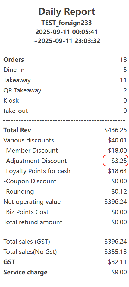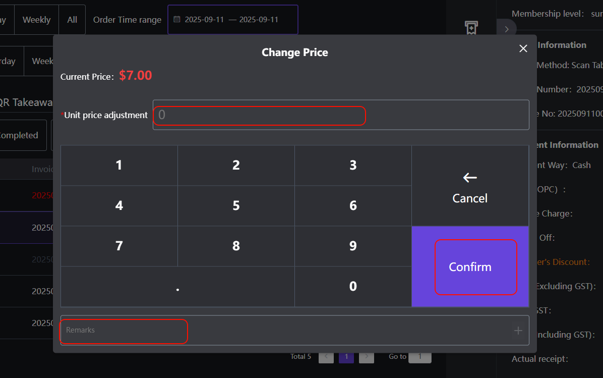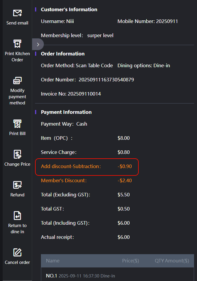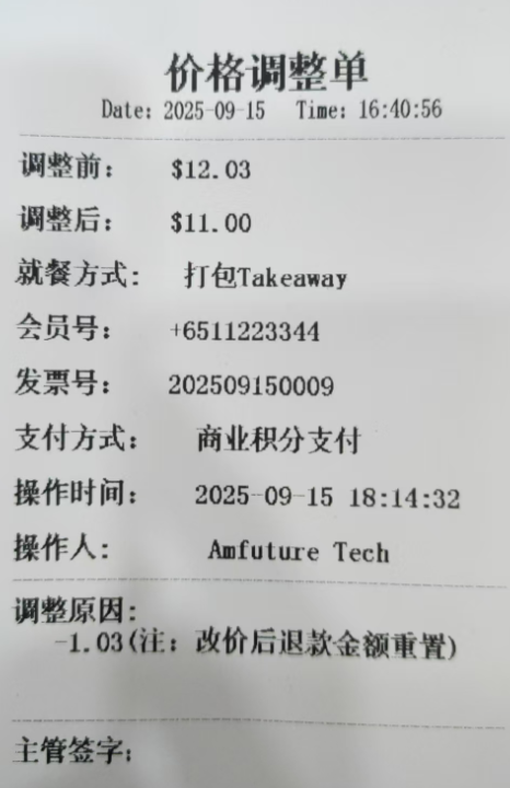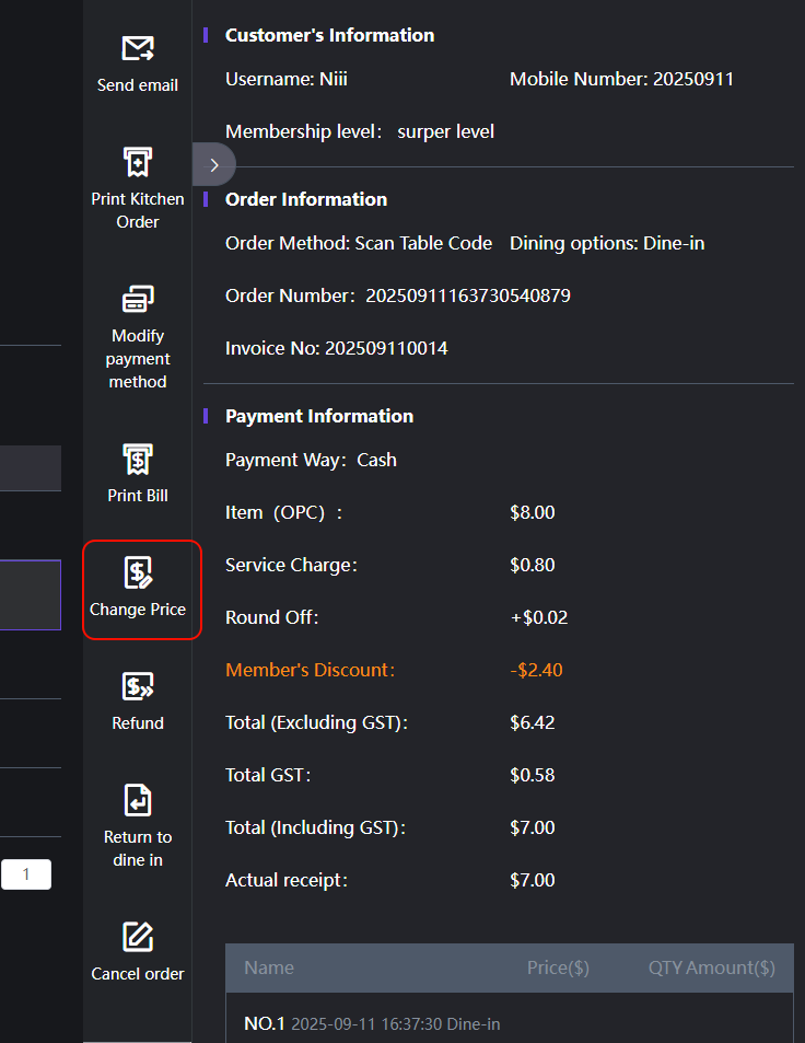 **Adjust the total price of the order (for completed orders, the refund amount will be reset after the price change) 对订单的总价进行调整(已完成的订单,改价后退款金额重置)** ## Operation process 操作流程 Click 'Modify Price' to enter the adjusted price, make a note (not required), and click 'Confirm' 点击‘修改价格’输入调整后的价格,进行备注(非必填),点击‘确认’   ## Modify the display 修改展示 ==**Due to the reduction of the total price, the corresponding GST is also reduced, and the corresponding display reduction fee is also different from the actual input, but the total price is equal according to the actual modified price**== 1.In the price details, the corresponding reduction amount will be displayed, which is displayed as 'Add discount-Price Reduction Method' 2. The price adjustment order will be printed, and the adjusted price will be displayed 3. In the daily statement, the discount method of the operation will be displayed in the corresponding discount of the day **==因总价减少,收取对应的GST也减少,对应的展示减少的费 用也于实际输入有差异,但总价根据实际修改的价格相等==** 1.在价格详情中,会显示对应减少数额,展示为‘减价/抹零-减价方式’ 2.会打印价格调整单,显示调整后的价格 3.在日结单中,操作的折扣方式,会对应显示在,当日对应的折扣内