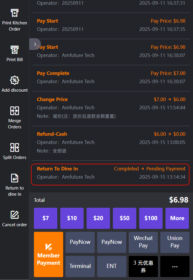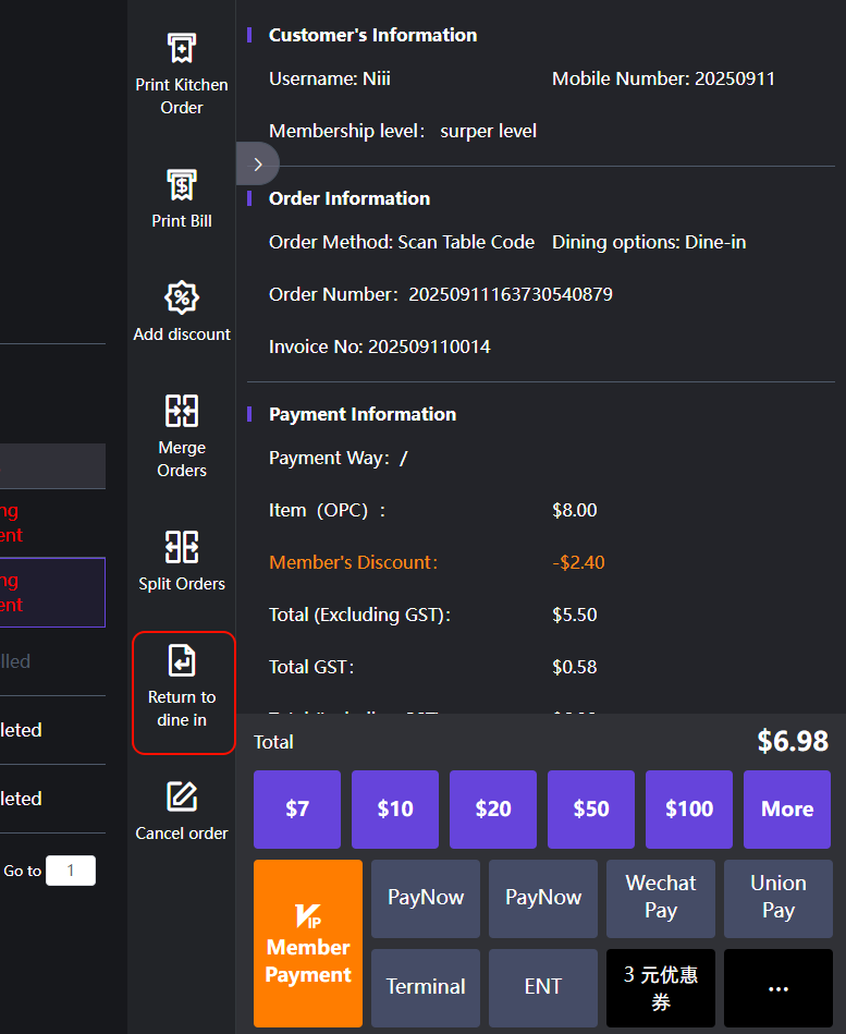 4.1.7 Return to dine in 返回桌台
