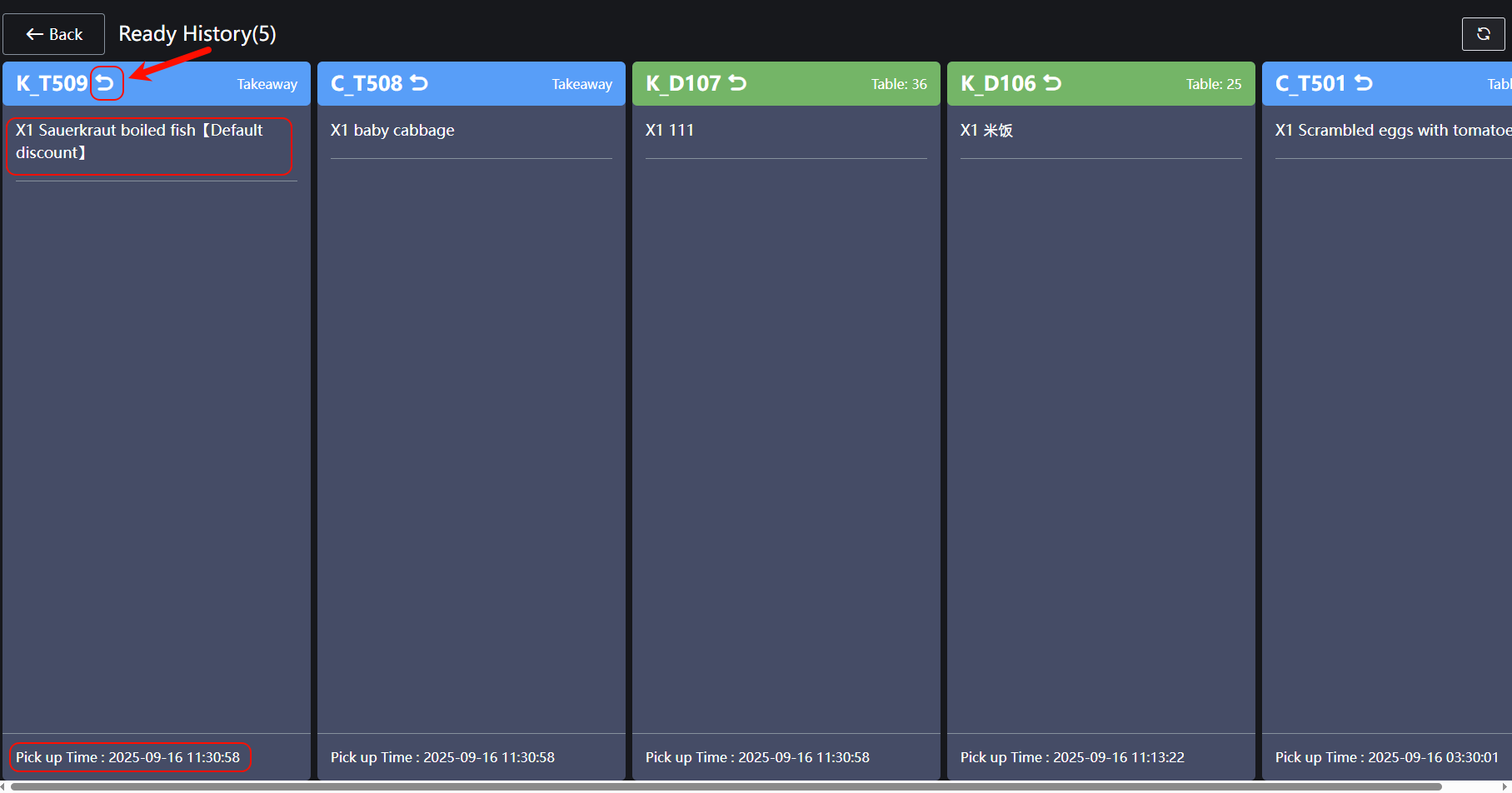 **The order needs to be returned to the pending status after the order has been picked up 订单已取餐需要返回待取餐状态** ## Operation process 操作流程 1.Click on 'History' to display the 'pick-up time' and 'product details' of the product 2.Click the 'Withdraw icon' to return the item to the status of pick-up and return it to the food for pick-up 1.点击‘历史记录’显示商品‘取餐时间’以及‘商品详情’ 2.点击‘撤回图标’将商品已取餐状态,退回待取餐
