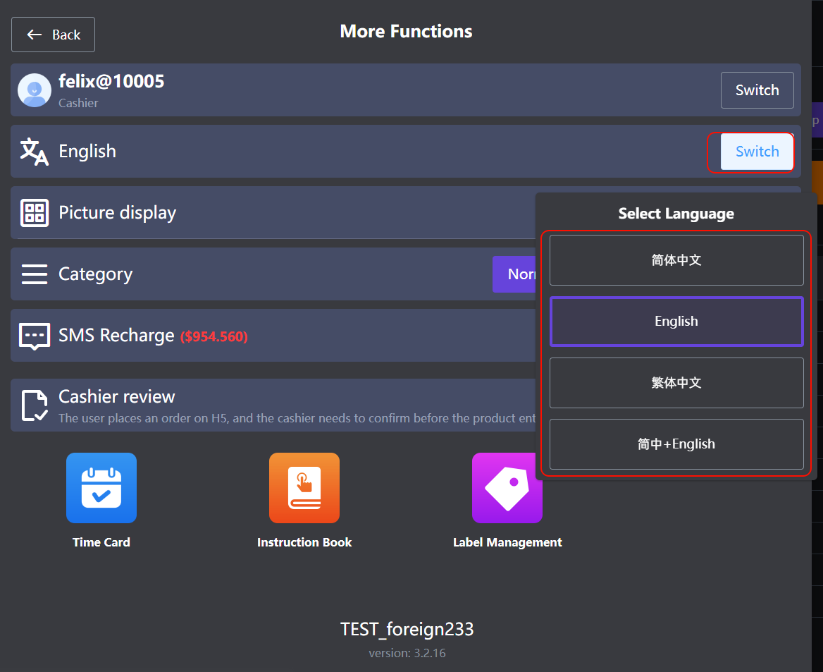 **Adjusting to the appropriate language is more convenient to operate 调整为合适的语言更方便操作** ## Operation entrance 操作入口 Click on the 'More' language navigation bar, click 'Switch' to select the language (**currently supported: Chinese Simplified, English, Chinese Traditional, Simplified Chinese + English, and can be modified in the background to modify the content displayed in different languages**) 点击‘更多’语言导航栏,点击‘切换’进行选择语言(**目前支持:简体中文、English、繁体中文、简中+English,且可在后台进行修改功能不同语言展示的内容**)   ## Modify the display 修改展示 ### 1.简体中文  ### 2.English  ### 3.繁体中文  ### 4.简中+Eglish Only the menu section will be bilingual 只有菜品部分会展示双语