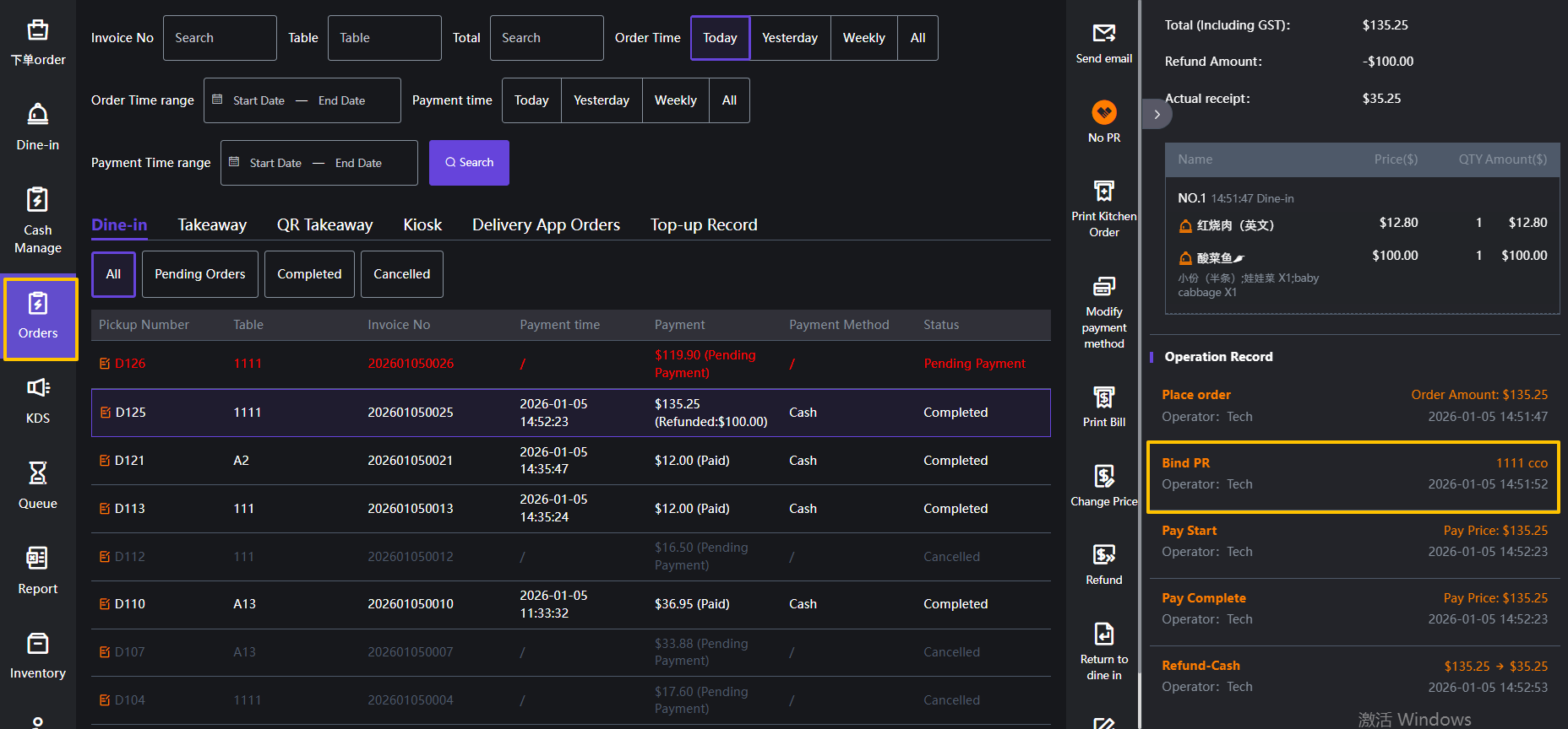 4.1.5 Print Kitchen Order/Print Bill 再次厨打/打印小票