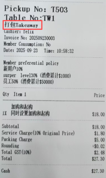 **Orders are placed through the cashier, and the dishes are packaged and ordered 通过收银员进行点单,菜品打包下单** ## Operation process操作流程 ### 一、打包界面下单 Select the dishes that customers need, make notes, discounts (not necessary), and collect payments according to customer needs 选择顾客所需要菜品,进行备注、折扣(非必要),并根据顾客需求进行收款  ### 二、通过堂食进行打包 **适用于需要挂单进行打包带走,或门店内桌台不足,先点单后进行转桌,且收取费用与打包界面下单相同,需要收取打包费(需要在后台开启设置)** #### 1.新增打包桌台 1.在堂食界面,选择‘打包’,点击‘打包订单’ 2.会新增一个虚拟桌台,点击进入点单,与‘堂食’点单相同 3.在支付完成后,这个虚拟桌台会进行保留,会根据后台设置的门店营业时间进行重置删除   ## 小票展示 ### 通过堂食进行打包 小票展示内容和堂食点单小票相同,显示桌台,但显示打包