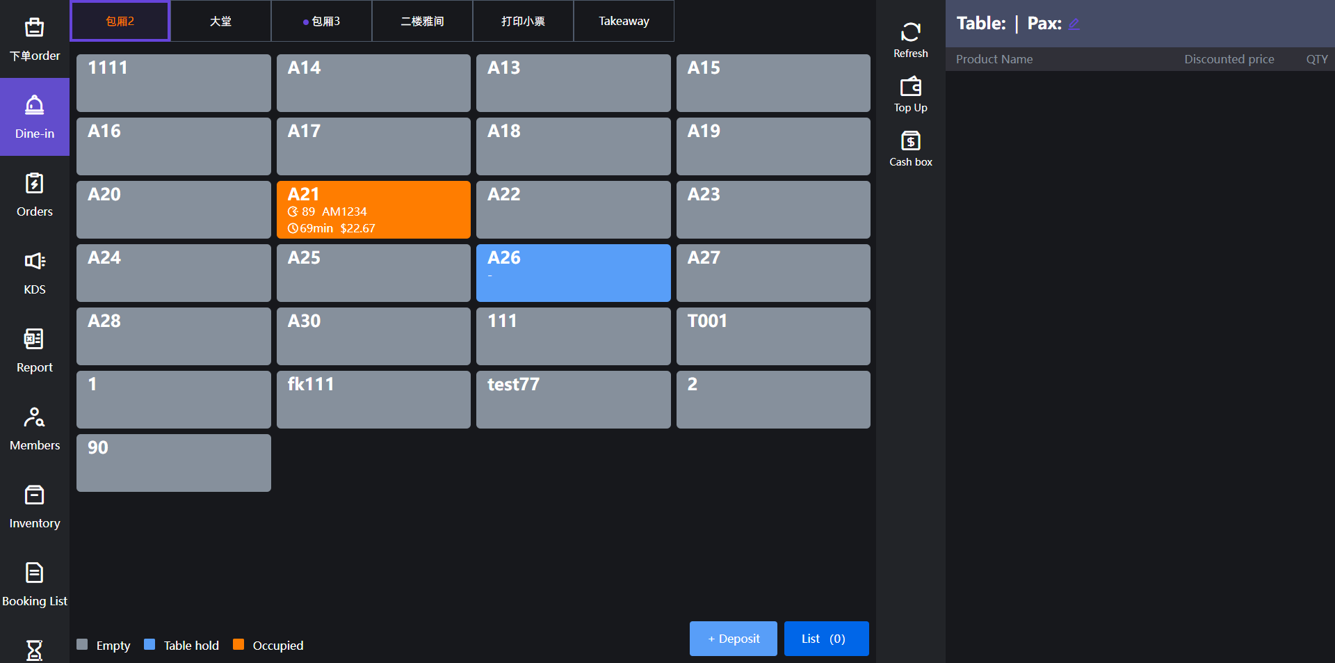 **If you place an order at the dine-in table, if you open the Takeaway virtual table, it will also appear here 堂食桌台下单,如果打开了Takeaway虚拟桌台,也会出现在这里** ## Operation process 操作流程 #### 1.Choose a table for dining in 选择堂食桌台 Grey: Not Open, Blue: Opened (No Order), Orange: Opened (Ordered) 灰色:未开启、蓝色:已开启(未下单)、橙色:已开启(已下单)  #### 2.Order 点单 Select the dishes required by customers, make remarks, discounts, wipe service fees (not necessary), and collect payments according to customer needs, as well as the operation of packing, disassembling and closing the table according to customer needs 选择顾客所需要菜品,进行备注、折扣、抹服务费(非必要),并根据顾客需求进行收款,以及客户需求进行,菜品打包、拆桌、合桌的操作
